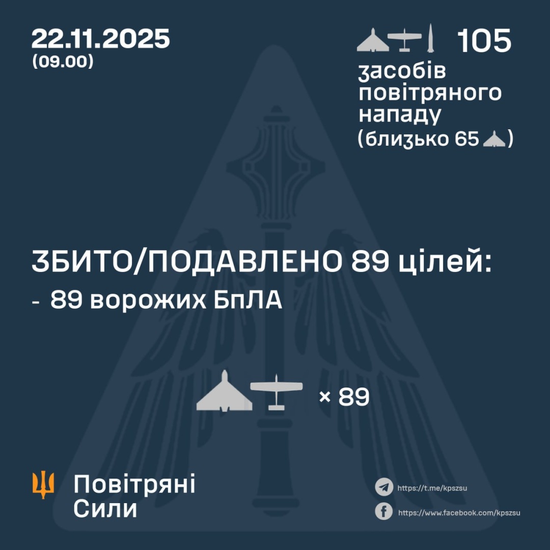 D'après les premières données, samedi 22 novembre à 9 h 00, la défense aérienne avait abattu ou neutralisé 89 drones dans le nord, le sud et l'est de l'Ukraine.