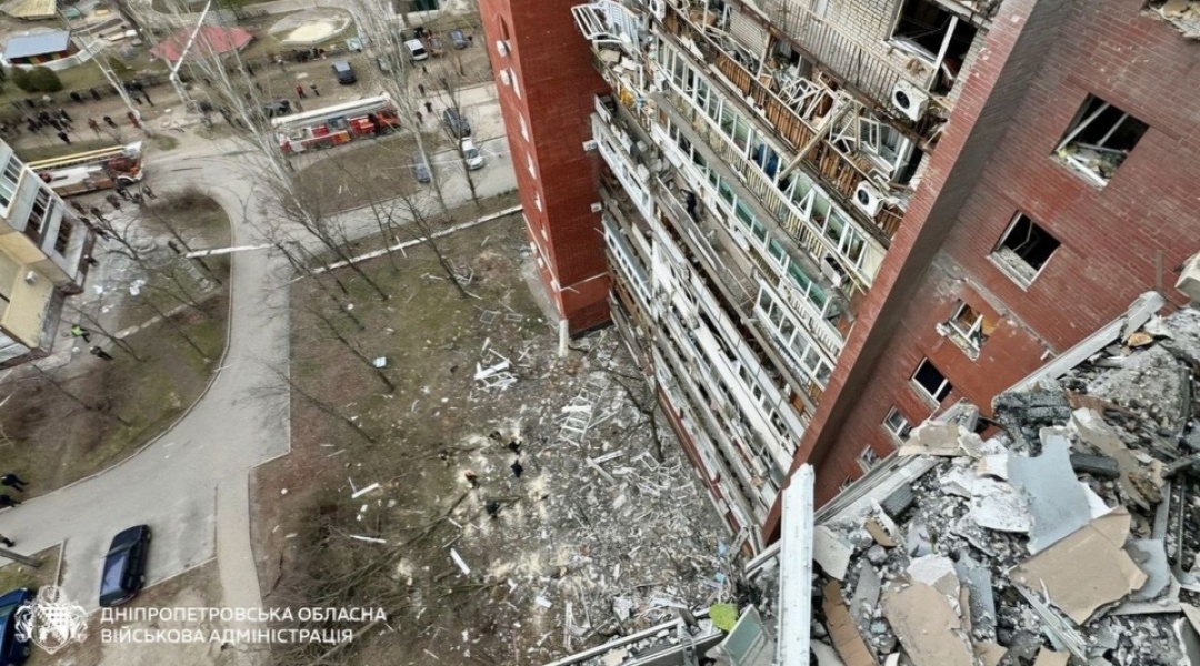 Un immeuble de quatorze étages endommagé lors d’une frappe russe sur Dnipro/ Photo : Administration militaire régionale