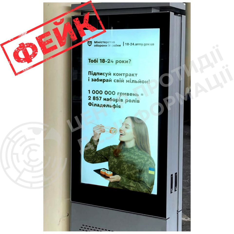 Selon le rapport, « les propagandistes russes diffusent une fausse publicité au nom du ministère de la défense de l'Ukraine appelant les jeunes à signer un contrat avec les forces armées pour un montant équivalant à près de trois mille sushis. L'image montre aussi une fille en uniforme, signe d'une mobilisation féminine ».