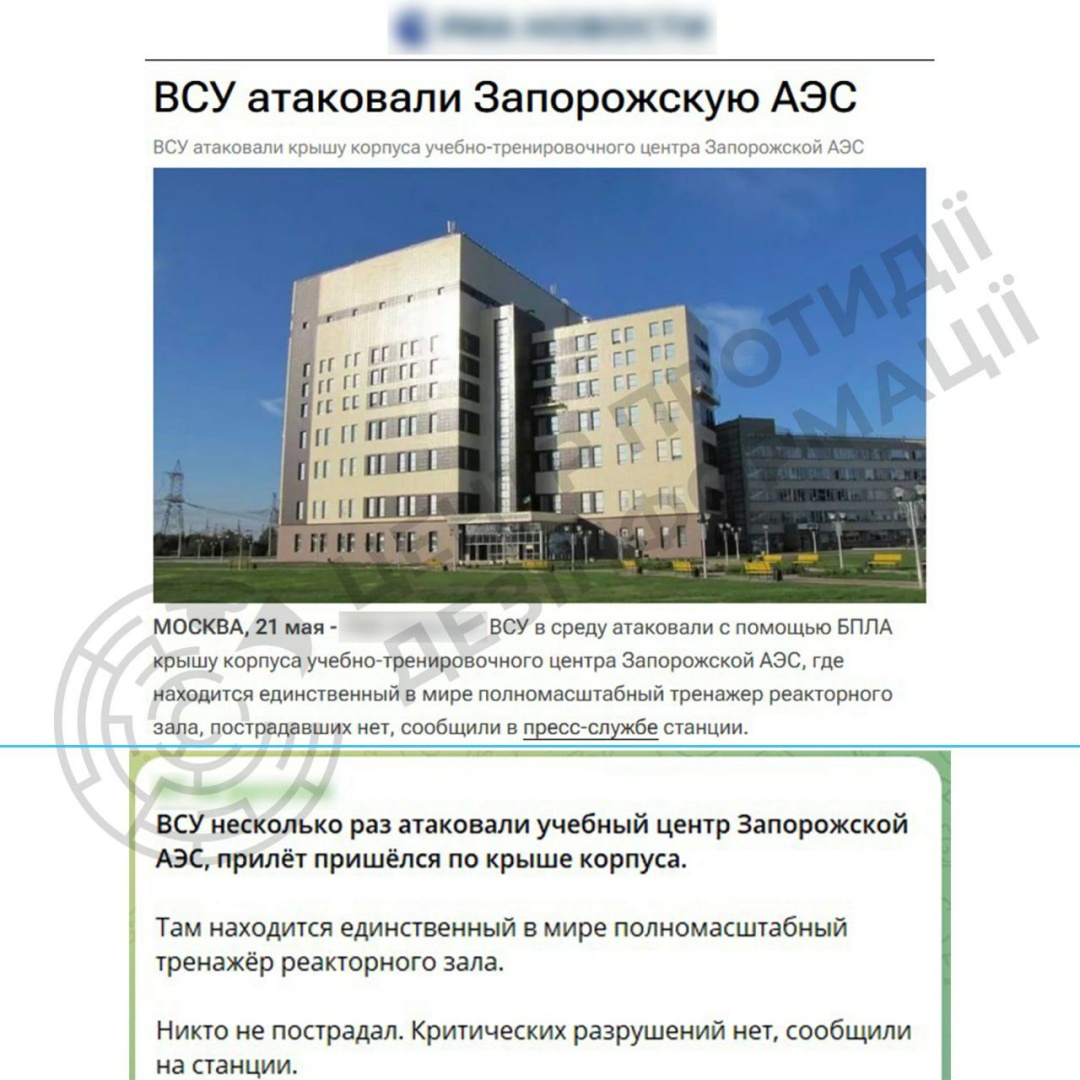 « La propagande russe a intensifié sa campagne de désinformation autour de la centrale de Zaporijjia dans le but de discréditer l'Ukraine. Des ressources hostiles diffusent une fausse information sur le « bombardement ukrainien » de l'une des installations sur le territoire de la centrale nucléaire de Zaporijjia. Les propagandistes affirment que les forces armées ukrainiennes auraient frappé le toit du bâtiment de formation de la centrale avec un simulateur de salle de réacteur. Comme dans d'autres cas de fausses accusations de bombardement de la centrale nucléaire de Zaporijjia contre l'Ukraine, les Russes ne fournissent pas de preuves », précise le communiqué.
