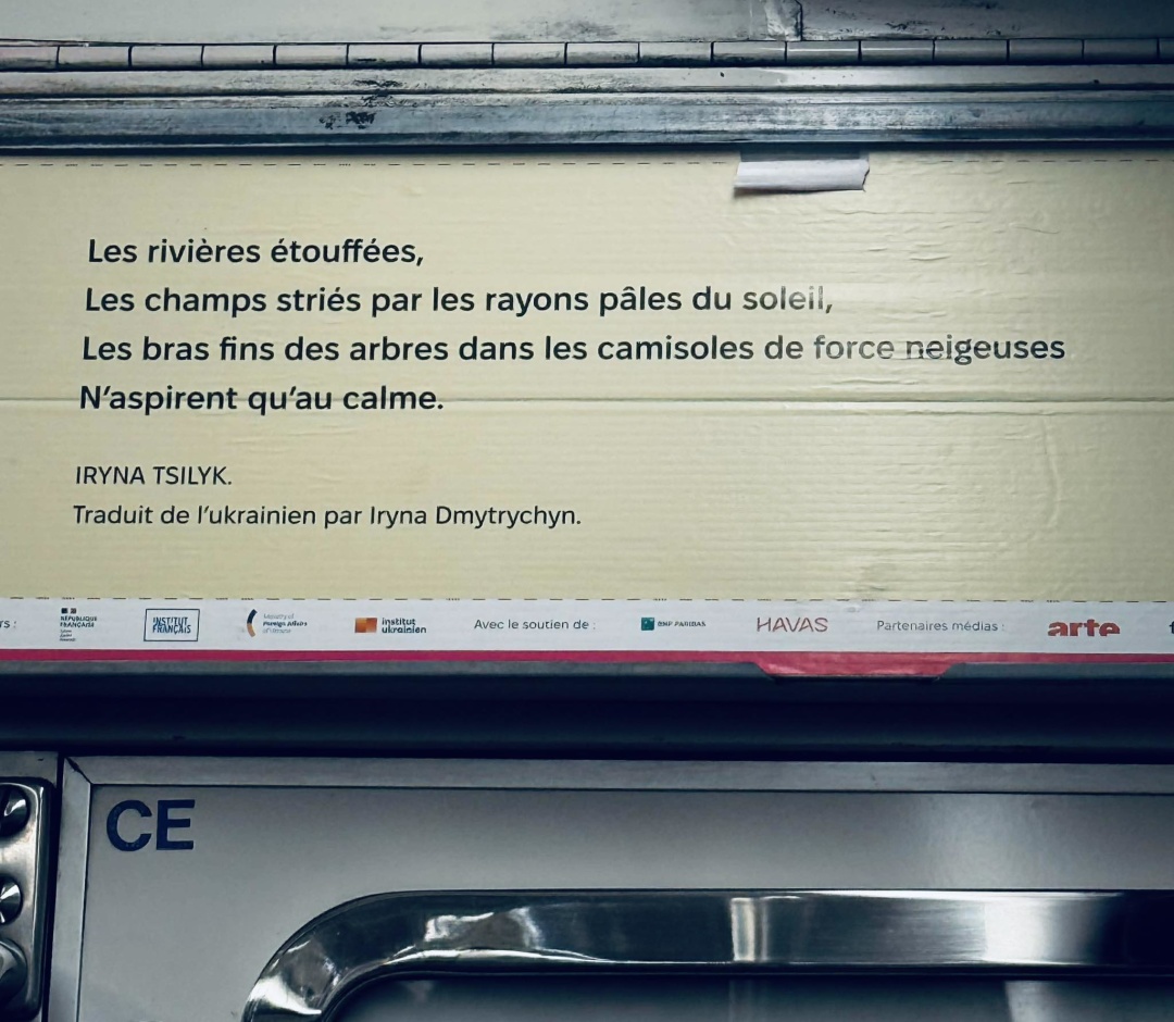 Jusqu’au 11 mars, les usagers du métro parisien pourront découvrir des vers de Lessia Oukraïnka, Lina Kostenko, Oksana Zabuzhko, Lyuba Yakymchuk, Ella Yevtushenko, Kateryna Kalytko, Iryna Tsilyk et Yaryna Chornoguz.